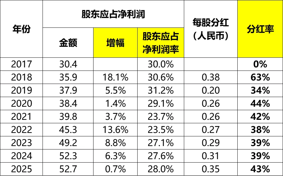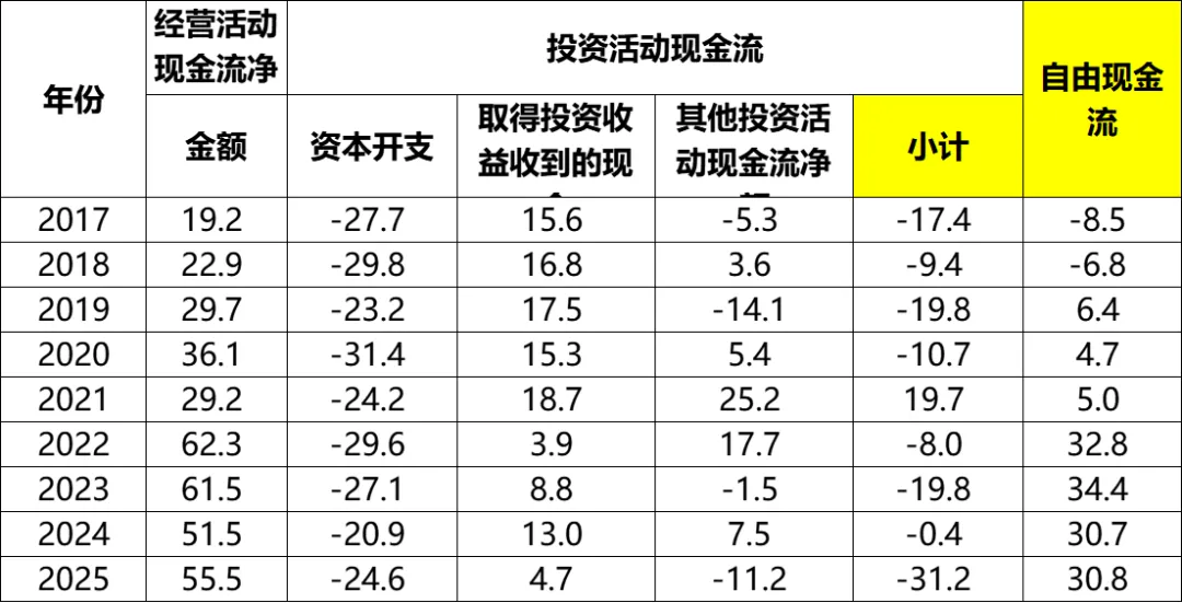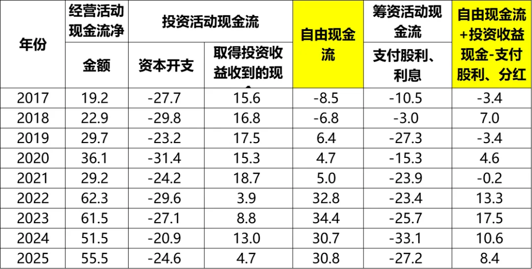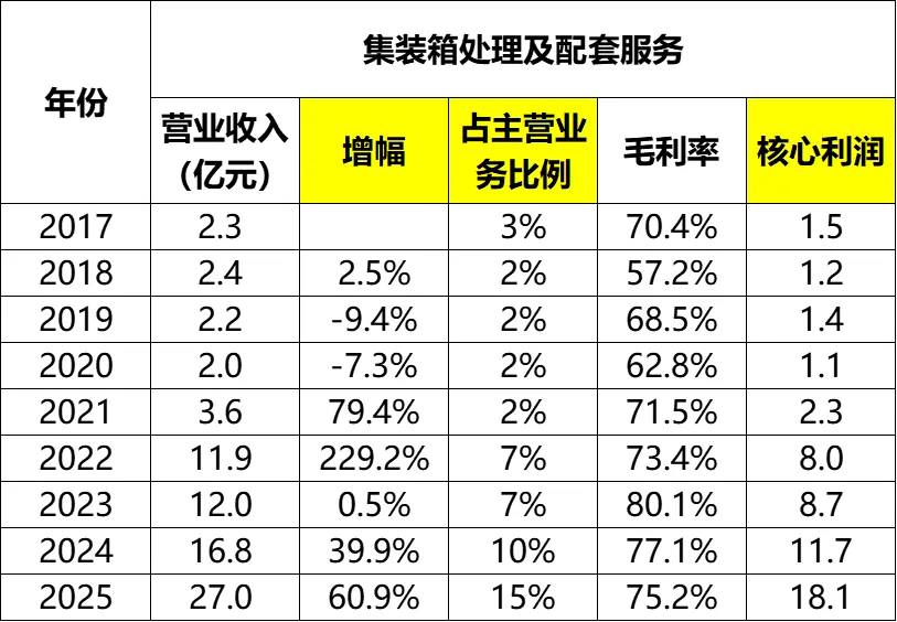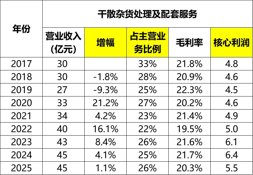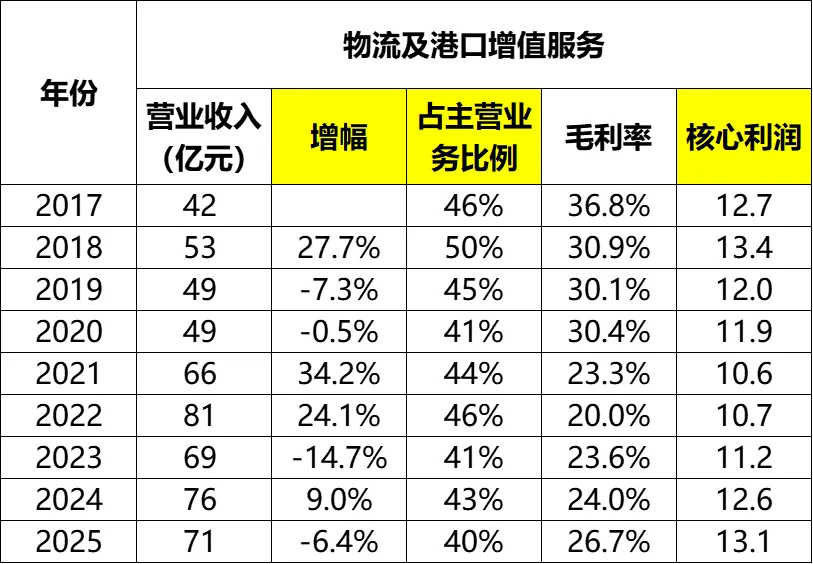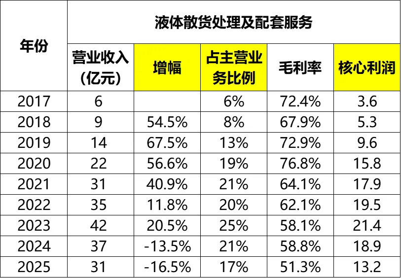 2025年公司全口径吞吐量7.22亿吨,同比增长4.0%,继续保持个位数增长。青岛港主营业务包含集装箱处理、干散货处理、液体散货处理、增值服务及配套服务五项,其中配套服务占比较低,就不展开了。整体来看,2025年主营业务176亿,同比略降0.1%。毛利率36.5%,同比增加0.9个百分点。核心利润(营业收入*(毛利率-税费率),下同)49.9亿,同比增加0.3亿。虽然主营业务整体没有什么增长,但是不同子业务之间的差异还是很大的。2025年,青岛港新增集装箱航线20条。集装箱处理及配套业务营收27亿,同比增幅60.9%,占主营业务比例15%,毛利率75.2%,贡献核心利润18.1亿。2026年计划新增集装箱航线10条,所以该业务在2026年有望继续保持高增长。(二)干散杂货处理及配套业务营收稳定,但毛利率下降2025年干散杂货处理及配套业务营收45亿,同比增长1.1%,占主营业务比例26%。毛利率同比下降1.4个百分点至20.3%,核心利润贡献下降0.9亿至5.5亿。(三)液体散货处理及配套业务营收、毛利率双降,是拖累公司业绩增长的最大因素2025年液体散货营收31亿,同比下降16.5%,连续两年保持两位数下降。占主营业务比例也从2024年的21%下降至17%。毛利率方面,同比下降7.5个百分点至51.5%。核心利润贡献下降6.7亿至13.2亿。青岛港物流及港口增值服务2025年营业收入71亿,同比下降6.4%。占主营业务比例40%。毛利率26.7%,同比增加2.7个百分点。虽然营收下降,但是得益于毛利率的增加,对核心利润的贡献反而增加0.5亿至13.1亿。从下图可以看到,公司2025年的销售、管理及研发费用合计13.6亿,同比增加1.2亿。主要增量来自于管理费用增加了0.9亿。如果我们把管理费用打开,可以发现,是职工薪酬增加了0.95亿:而薪酬的增加也不是因为员工的增加。公司2024年在职职工9552人,2025年9728人,人数增加不足200人,但是薪酬增加了16%。算了,不纠结这个。工资涨了也不是啥坏事,多多少少可以促进消费,哈哈。在我的分析体系中,核心利润=合并利润表营业收入-营业成本-税金及附加-销售费用-管理费用-研发费用。2025年青岛港核心利润53.6亿,同比增长1.0%。2025年投资收益15.4亿,同比下降9.3%或1.5亿。这是拖累公司业绩的第二大因素。青岛港的投资收益主要来源于联营合营企业的投资收益,对数据追根溯源,可以发现是以下3家联营合营公司的收益亏损加大或收益下降导致了整体的收益下降。不过,虽然2025年投资收益下降,但是长期股权投资收益率仍然达到9.8%,保持在较高水平。2025年股东应占净利润52.7亿,同比微增0.7%,显著低于5%左右的预期。分红方面,每股分红0.35元,股息率约4%,勉强可接受吧。2025年度分红率提升到43%。青岛港2025年经营现金流净额55.5亿。资本开支24.6亿,同比增加3.7亿。自由现金流30.8亿。自由现金流加上投资收益取得的现金减去支付股利、利息支出的现金后,目前还略有盈余。资本开支方面,预计今后几年都会保持高位,因为公司又要投资两个码头,合计150多亿,建设周期4年,也就是平均每年30多亿的开支。如此一来,公司未来几年的分红能维持在40%就不错了,估计还要借点外债才能支持建设。当然,对于这类投资,我个人是支持的,毕竟带来的是增量,而且根据公告,这两个码头的内部测算收益率都在8%左右。------------分割线------------写作不易,如果觉得有用,可以【点赞】+【小爱心】鼓励一下!感谢您的支持!!