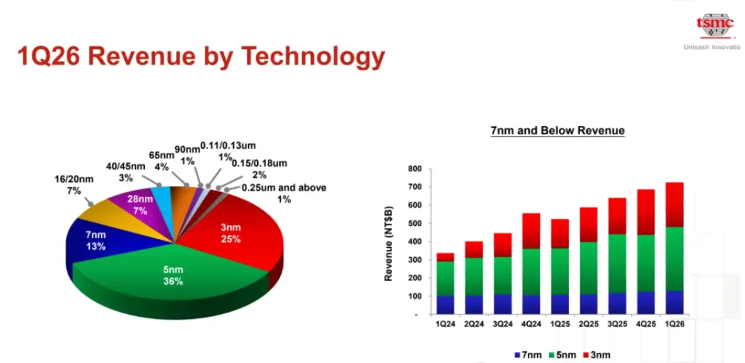 先进制程的绝对统治: 3nm工艺营收占比飙升至25%,5nm占比36%,7nm占比13%。三者合计64%的先进制程占比,构筑了高毛利的基本盘。