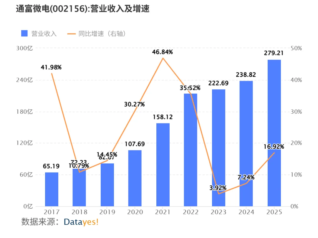 基于公司于2026年4月17日发布的2025年年度报告及近期相关研报,我们对通富微电的最新业绩、核心驱动力及未来战略进行详细解读。25年全年业绩概览:营收与利润双创新高,增长动能强劲2025年,通富微电在半导体行业结构性复苏及AI浪潮的推动下,实现了历史性的业绩突破。全年实现营业总收入 279.21亿元 ,同比增长 16.92% ,创下历史新高。这一增速超过了公司此前设定的约11%的增长目标全年实现归母净利润 12.19亿元 ,同比大幅增长 79.86% ;扣非后归母净利润为8.41亿元,同比增长35.34%。净利润增速远超营收增速,显示出盈利能力的显著改善。业绩增长呈现逐季加速态势。特别是第三季度(Q3),单季度归母净利润同比增长 95.08% ,增速领跑行业。第四季度(Q4)归母净利润同比增长 186.41% ,在高基数上依然保持了极高的增长弹性尽管面临行业波动,公司通过内部优化实现了盈利质量的实质性提升。2025年全年销售净利率达到 4.93% ,同比提升1.62个百分点。这主要得益于 中高端产品营业收入明显增加 带来的产品结构优化,以及加强管理及成本费用管控。从季度看,Q3单季净利率高达 7.19% ,为全年峰值全年销售毛利率为 14.59% ,较上年同期微降0.26个百分点。Q4单季毛利率为12.86%,环比有所下滑。这可能与季度间产品结构、产能利用率及市场竞争有关。公司期间费用率得到有效控制。在运营方面,总资产周转率为0.64次,存货周转率为6.30次,整体运营效率保持稳定这是公司最核心的增长引擎。公司自2015年与AMD达成战略合作,是其最大的封测供应商,承接其超过八成订单。2025年10月,AMD与OpenAI达成为期四年的重大供应协议,计划部署总计6GW的AI算力基础设施(基于AMD芯片),预计将为AMD带来每年数百亿美元的新增营收。作为AMD的核心封测厂(AMD持有通富苏州及槟城厂各15%股份),公司有望 深度受益于此轮AI芯片的放量。2025年上半年,来自AMD的订单收入占比超过六成公司在非AMD业务领域拓展成效显著,降低了单一客户依赖风险。- 汽车电子:成为增长亮点,2024年营收同比大增200%,2025年持续快速扩张,客户覆盖数量翻番。