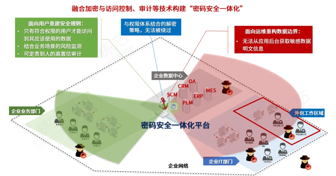 本方案核心采用自主研发的AOE(面向切面加密)技术,在应用运行时层面注入切面,精准拦截敏感数据处理流程,无需修改任何应用源码,即可实现字段级加密、脱敏、动态访问控制等能力。架构方面,构建"密码安全一体化"分布式体系,将加密、密钥管理、访问控制、审计深度融合,形成防绕过闭环,支持"两地三中心"部署及国产信创适配。部署上采用非侵入式旁路/代理策略,于业务低峰期配置化上线,实现零停顿、零改造的平滑升级。