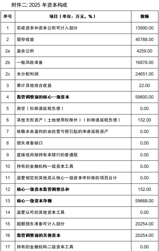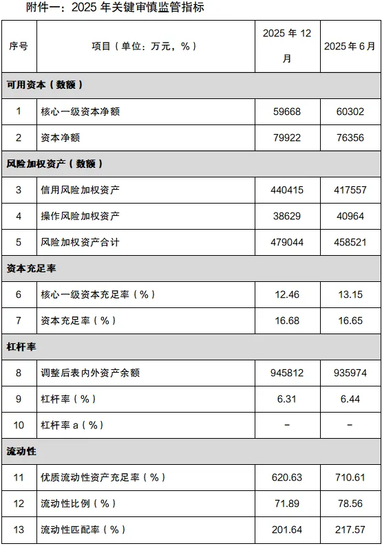 按照《商业银行资本管理办法》(国家金融监督管理总局令2023年第4号)规定,本行风险加权资产包括信用风险加权资产和操作风险加权资产,其中信用风险采用权重法计量,操作风险采用基本指标法计量。截至2025年12月31日,本行核心一级资本充足率为12.46%,资本充足率为16.68%,杠杆率为6.31%。核心一级资本充足率、资本充足率和杠杆率均高于监管要求阀值。本次披露2025年关键审慎监管指标和2025年资本构成,具体如下表: