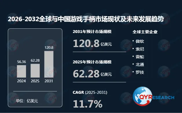根据QYR(恒州博智)的统计及预测,2025年全球游戏手柄市场销售额达到了62.28亿美元,预计2031年将达到120.8亿美元,年复合增长率(CAGR)为11.7%(2025-2031)。