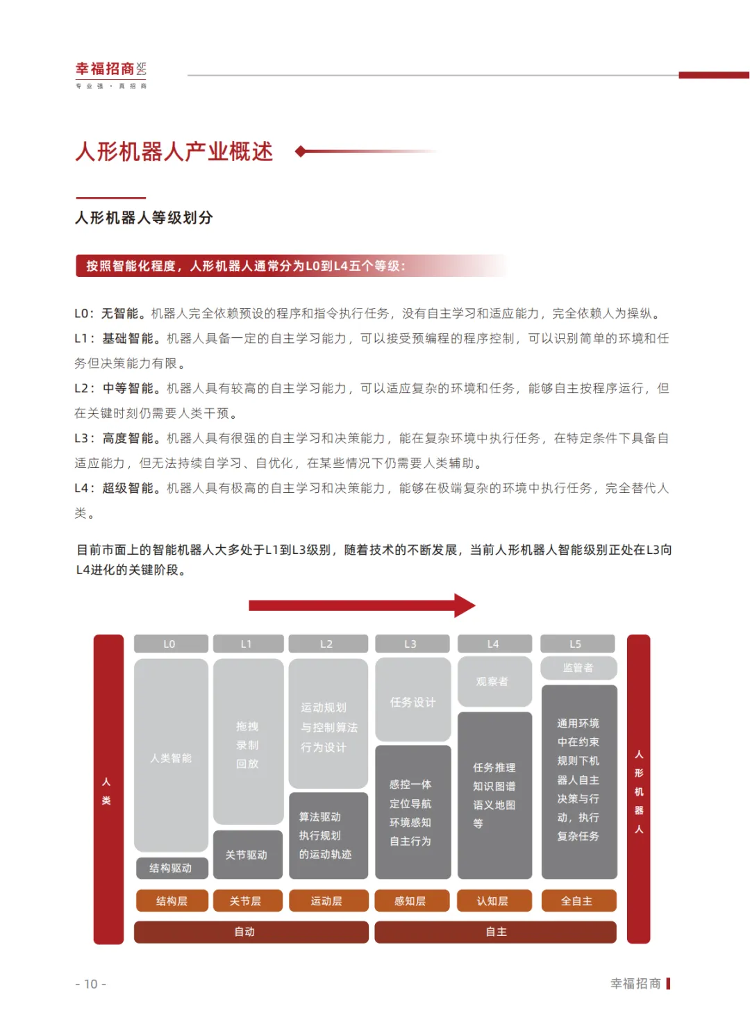 智能化等级:人形机器人按智能化程度分为L0(无智能)到L4(超级智能)五个等级。目前市面上产品大多处于L1到L3级别,产业正处在从L3向L4进化的关键阶段。