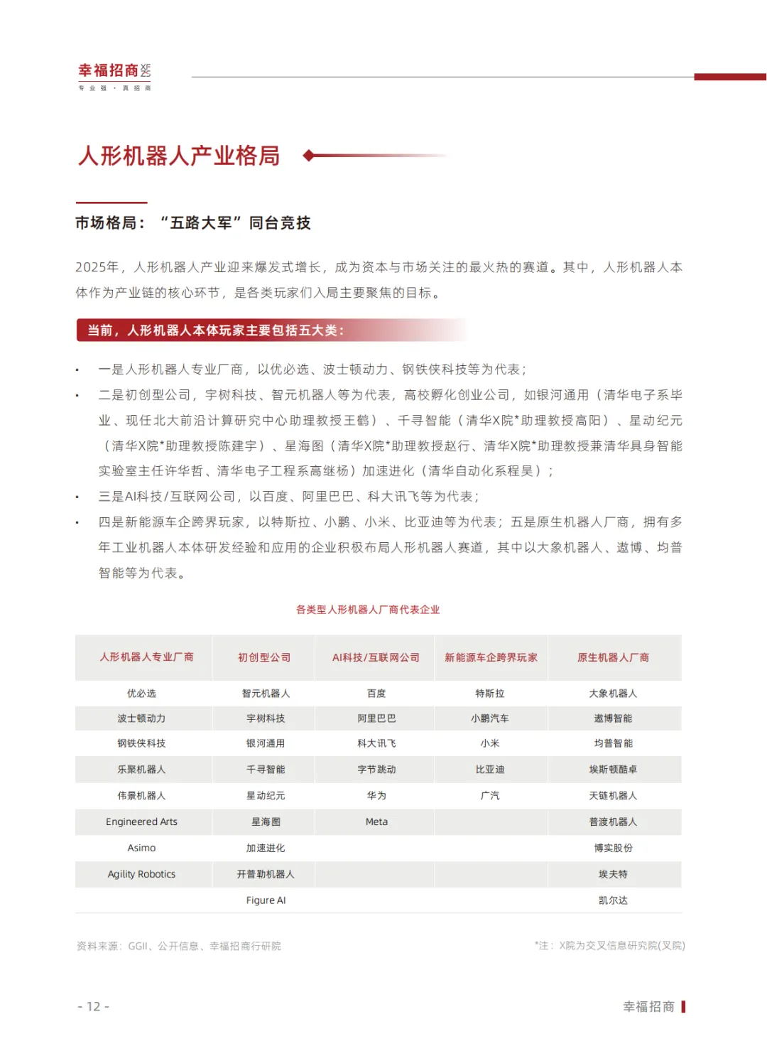 创新破局者 | 以“技术颠覆+资本杠杆”或“算法赋能+生态整合”快速突破,重构规则。 | 初创公司:宇树科技、智元机器人、Figure AIAI/互联网公司:百度、阿里巴巴、华为、科大讯飞 |