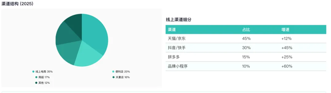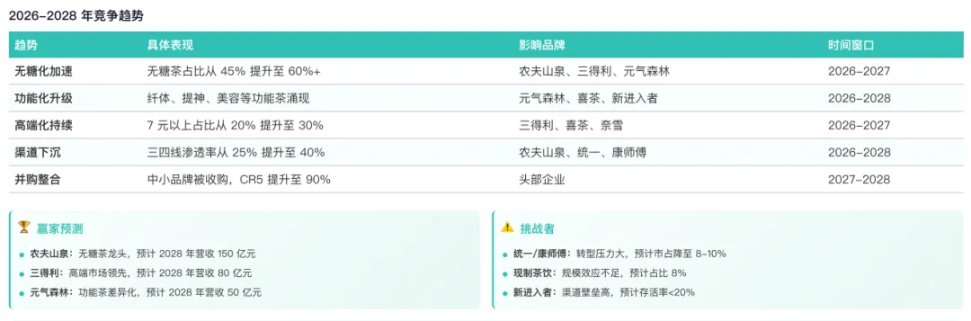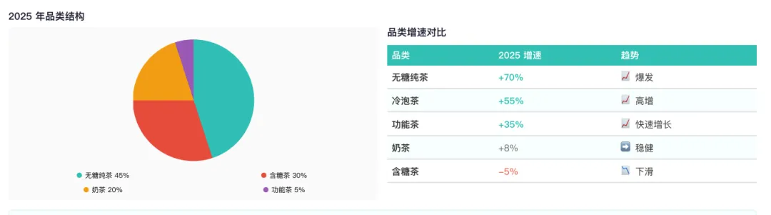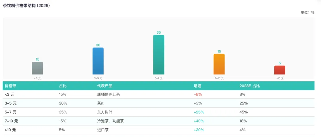 2020-2025年间,中国茶饮料市场年均复合增长率(CAGR)约为10%,显著快于饮料行业整体5%的增速。其中,2021年以11.7%的增速达到峰值,主要受益于疫情后健康意识提升与无糖茶品类爆发;2022-2023年受疫情影响增速放缓至8-10%;2024-2025年恢复至9-12%的双位数增长,核心驱动力为无糖茶渗透率的持续提升。人均消费额从2020年的10.3元上升至2025年的16.5元,CAGR同样约10%。对照日本(80元)、美国(45元)、中国台湾(35元)的人均消费水平,中国大陆市场仍有3-5倍的提升空间。主要驱动因素包括消费频次提升(从年均15瓶增至25瓶)与客单价上行(从4元升至6元)。无糖茶品类贡献突出,规模自2020年145亿元增至2025年1,058亿元,CAGR超过70%,贡献行业增量60%以上。同期,含糖茶规模从800亿元萎缩至705亿元,占比从55%下降至30%。预计2026年无糖茶规模将达1,352亿元,首次占据行业整体50%以上,成为绝对主导品类;到2028年,无糖茶规模预计进一步增至1,800亿元,占比达60%,而含糖茶规模将萎缩至500亿元以下。2. 四大引擎驱动无糖茶爆发,健康需求与渠道变革是关键健康意识的觉醒是无糖茶市场发展的核心驱动力。在《健康中国2030》政策引导及糖尿病(中国成人患病率约12%)、肥胖(患病率约16%)人群不断扩大的背景下,约65%的消费者会主动选择0糖0卡产品。2023年实施的营养标签强制标注新规,要求明确标示糖含量与热量,进一步加速了消费者教育。无糖茶“0糖0卡0脂”的产品特性精准契合这一健康需求,因而成为市场首选。产品力的提升为市场扩张提供了关键支撑。随着原叶茶萃取技术日益成熟,例如东方树叶采用的“茶源萃取”与三得利的“乌龙茶专用萃取”工艺,能在保留茶香的同时有效降低苦涩感。口感的显著改善使产品成功摆脱了以往“苦涩”的标签,复购率从2020年的25%大幅提升至2025年的45%。冷泡技术(低温冷萃8-12小时)的进一步应用,降低了苦涩度并提升了茶汤的顺滑感,支撑了高端产品约50%的溢价。营销创新则加速了品类渗透。东方树叶凭借“0糖0卡0脂0香精0防腐剂”的“五0”概念深入人心,2023年其在小红书的相关笔记超过200万篇,抖音话题播放量达50亿次以上。元气森林作为“0糖0脂0卡”概念的营销先行者,在2020至2022年间投入约15亿元营销费用,快速建立起品牌认知。KOL种草与直播带货也极大地助推了市场渗透。渠道变革进一步扩大了市场覆盖。在便利店渠道,无糖茶的SKU占比从2020年的20%提升至2025年的45%,全家、7-11、罗森等主流便利店的排面占比已超过50%,单店月销量可达200-500瓶,坪效高出含糖茶约30%。同时,在自动售货机、办公室无人货架等新兴渠道中,无糖茶的占比也已超过60%,有效触达了白领核心消费人群。1. Z世代与女性主导,高线市场是核心但下沉增速快Z世代(18-25岁)是绝对主力,占比高达45%。他们成长于健康消费时代,对0糖概念的接受度(85%)显著高于中年群体(45%),且70%的人愿意为品质支付5-7元的溢价,而中年群体该比例仅为40%。Z世代品牌忠诚度较低,年均尝试5-8个品牌,尝鲜意愿强烈,这驱动了冷泡茶、功能茶等创新品类的发展,其在此类产品中占比超过70%。作为小红书、抖音的重度用户,他们极易受KOL种草影响,东方树叶、元气森林等品牌正是通过社交媒体营销迅速渗透了这一群体。女性用户占比55%,是另一大核心人群。她们比男性更关注0糖0卡(75% vs 55%)、美容养颜(35% vs 15%)和体重管理(45% vs 25%)等功能诉求。因此,在功能茶(如纤茶玉米须、菊花系列)和冷泡茶中,女性占比分别高达70%和60%。男性则更偏好无糖纯茶(60% vs 女性50%),消费场景多集中于运动后与工作提神。此外,女性对包装颜值更为敏感,65%会因包装产生购买,而男性该比例仅为35%,东方树叶、三得利的简约设计备受女性青睐。从市场层级看,一二线城市是核心市场,贡献了60%的消费。这里便利店密度高(一线城市平均达8000家/城,三线城市约为500家),无糖茶渗透率(55%)远高于三线城市(25%),且消费频次(年均30瓶)和客单价(6元)也更高。三线及以下城市虽占比40%,且增速更快(+25% vs 一线城市+10%),但目前无糖茶渗透率仍较低(25%),含糖茶占据主导(60%)。下沉市场是未来增量的关键,统一、康师傅凭借在县乡市场高达80%的覆盖率,相比农夫山泉(约60%)拥有更明显的渠道优势。健康意识的觉醒,尤其是对“0糖”的追求,已成为无糖茶消费的核心驱动力。在《“健康中国2030”规划纲要》的政策引导与糖尿病、肥胖人群不断扩大的背景下,约65%的消费者会主动选择0糖产品。2023年实施的营养标签强制标注新规,进一步加速了信息透明化,使得含糖茶的劣势与无糖茶的健康优势更加凸显。预计到2026-2028年,消费者对0糖的关注度将提升至75%。在次要购买动机中,解渴与口感(52%)是最普遍的诉求,其次是提神醒脑(38%)、佐餐搭配(28%)和社交/颜值分享(18%)。无糖茶的咖啡因含量通常在30-50mg/瓶(约等于1/3杯咖啡),具有适中的提神效果,同时又避免了咖啡可能引发的心悸、失眠等副作用,使其在办公、学习、熬夜等场景中成为受欢迎的替代选择。3. 线上高速增长,便利店是核心支点,商超角色分化线上渠道销售占比已从2020年的20%快速提升至35%,年均增长15%。天猫/京东作为基本盘,占线上45%的份额,增速稳定在12%;抖音/快手占比30%,增速高达45%,是重要的增长引擎;拼多多占比15%,核心吸引价格敏感人群;品牌自营小程序虽仅占10%,但凭借高复购用户(复购率70%+)实现了60%的