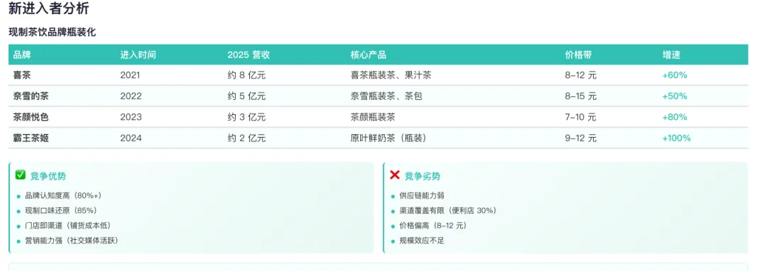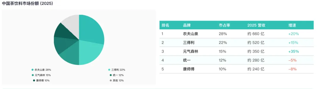 1. 消费者画像:Z 世代成消费主力,女性与一二线为核心群体2. 消费市场 - 购买渠道:线上 + 便利店双轮驱动,渠道结构快速重构3. 消费市场 - 价格带:5-7 元成主流价格带,行业高端化趋势不可逆4. 区域差异:华东领跑区域市场,下沉市场藏巨大增量空间三、CR5 达 87% 高度集中,头部品牌瓜分无糖红利1. 市场格局:农夫山泉领跑赛道,国产品牌崛起反超外资2. 农夫山泉:十年磨一剑,东方树叶坐稳无糖茶龙头3. 三得利:日系品牌深耕高端,乌龙茶心智牢不可破4. 元气森林:新势力弯道超车,功能化打造差异化优势5. 统一 & 康师傅:传统巨头承压转型,含糖基本盘持续缩水6. 新进入者:现制茶饮入局瓶装,高端细分市场迎挑战者7. 趋势预测:无糖化 + 高端化 + 下沉,三大趋势定未来格局此报告由“勤策消费研究”出品。下载完整《2026年中国茶饮料行业研究报告——⽆糖茶爆发式增⻓,健康化驱动⾏业重构》请至勤策消费研究微信公众号回复“2026茶饮料”获取。