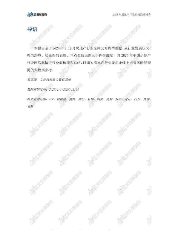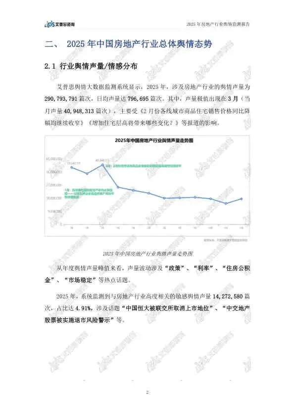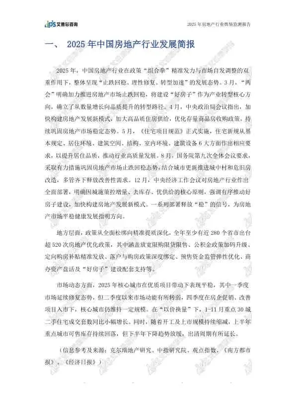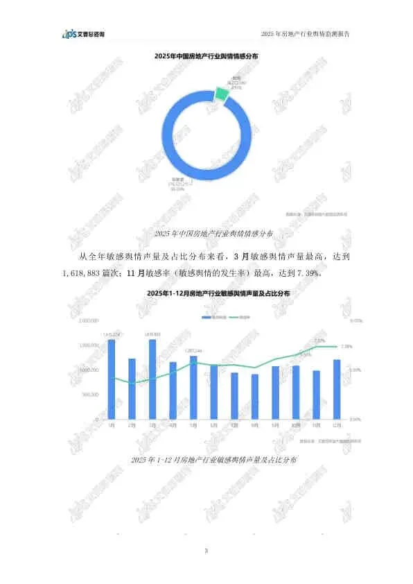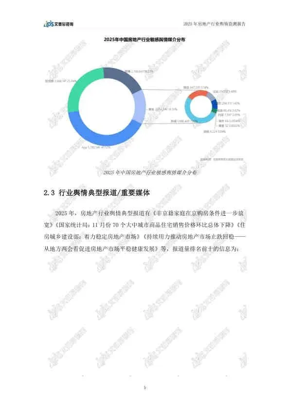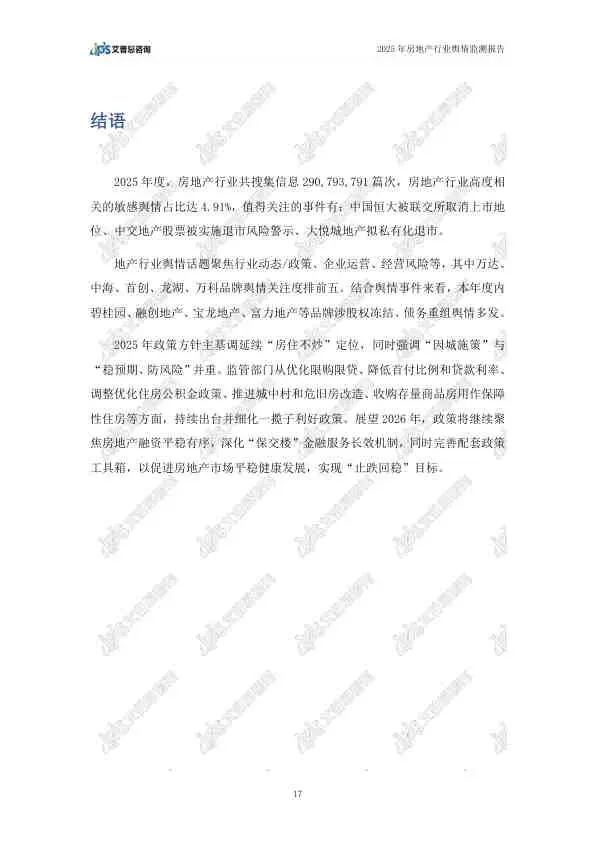 这份由艾普思咨询发布的《2025年中国房地产行业舆情年度报告》,基于2025年全年的网络公开数据,全面复盘了房地产行业的舆论风向。报告指出,2025年房地产市场在政策密集出台的背景下呈现“止跌回稳”态势,但负面舆情依然高企,主要集中在头部房企的退市、债务违约等风险事件上。以下是详细总结: