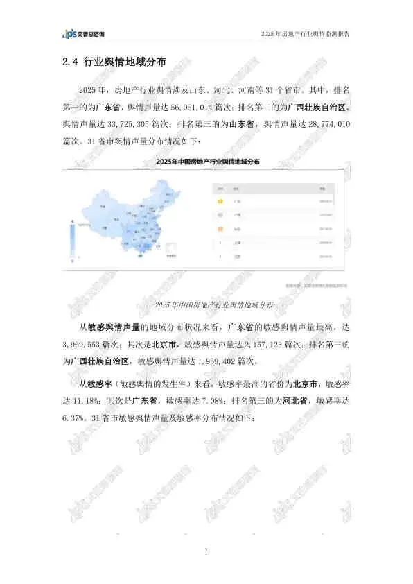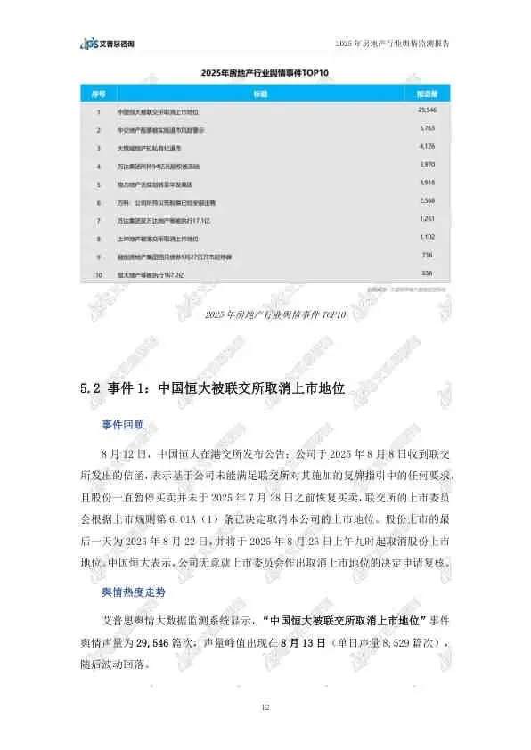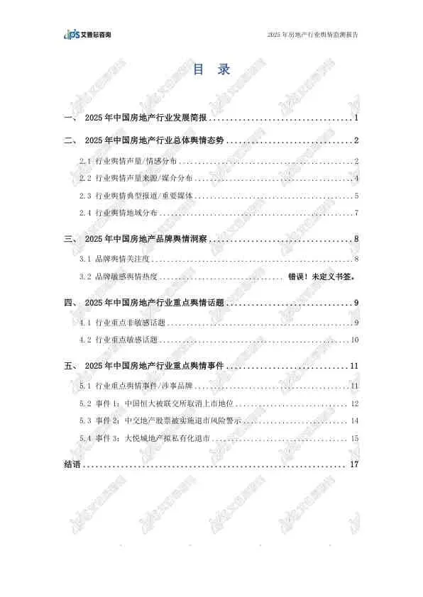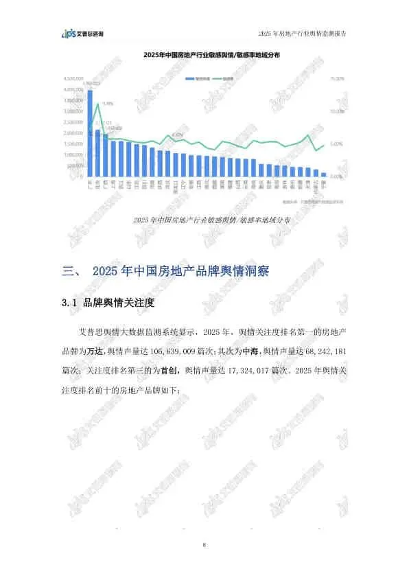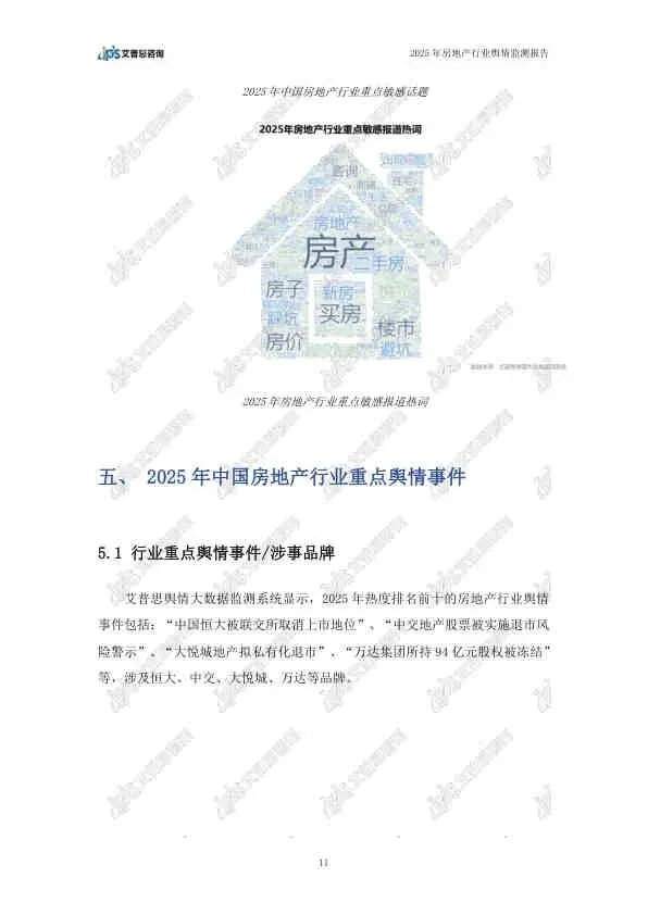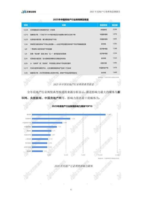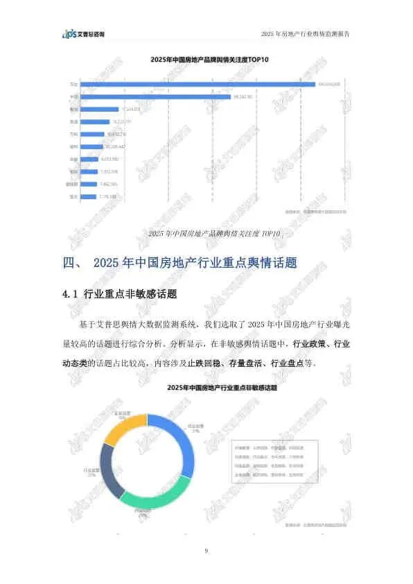 这份由艾普思咨询发布的《2025年中国房地产行业舆情年度报告》,基于2025年全年的网络公开数据,全面复盘了房地产行业的舆论风向。报告指出,2025年房地产市场在政策密集出台的背景下呈现“止跌回稳”态势,但负面舆情依然高企,主要集中在头部房企的退市、债务违约等风险事件上。以下是详细总结: