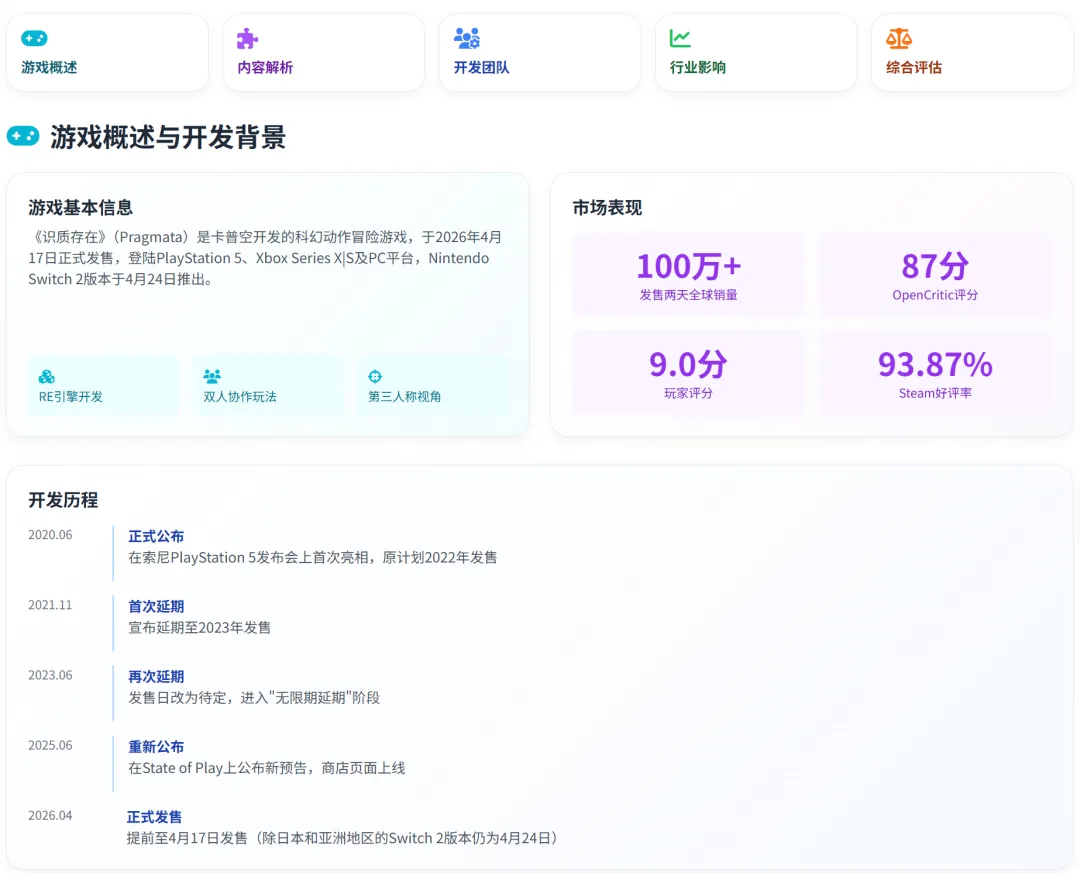 识质存在(Pragmata)作为卡普空历经六年打磨、两次延期后最终推出的全新科幻动作 IP,自 2026 年 4 月发售以来迅速成为市场焦点。这款由 RE 引擎打造、主打 “破解射击 + 双人协作” 的第三人称动作冒险游戏,凭借独特的玩法机制、细腻的人机羁绊叙事与顶尖的画面表现,在全球范围内收获销量与口碑双丰收:发售两天销量突破 100 万份,Steam 好评率高达 93.87%,媒体综合评分稳定在 86 分以上,成为近年来少有的原创 IP 成功案例。本报告从开发背景、核心玩法、叙事哲学、角色塑造、技术实现、市场表现与行业价值七个维度,对《识质存在》进行系统性深度研究,还原其从立项到成品的完整历程,并总结其对游戏行业的借鉴意义。