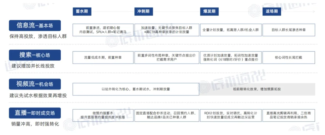 618想要高效拿量,品牌需协同4大投放场域及投放节奏,遵循「前置种草—关键期放量—长尾渗透」的节奏,通过精细化词性布局与优质计划放量,实现从种草到转化的全链路覆盖。