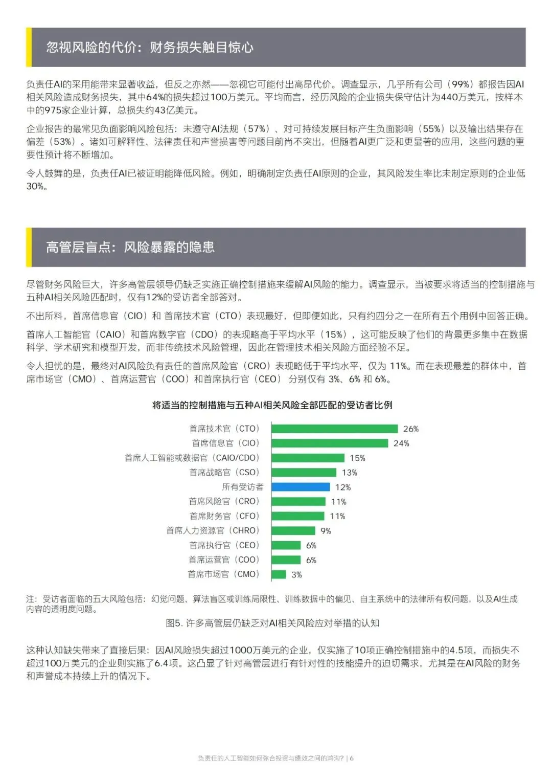 当前高管层普遍存在 AI 风险认知盲区,能准确匹配风险与控制措施的比例极低,CEO、COO、CMO 等核心管理者认知尤为不足。风险损失越高的企业,对应的控制措施落地越少,凸显高管能力提升的紧迫性。