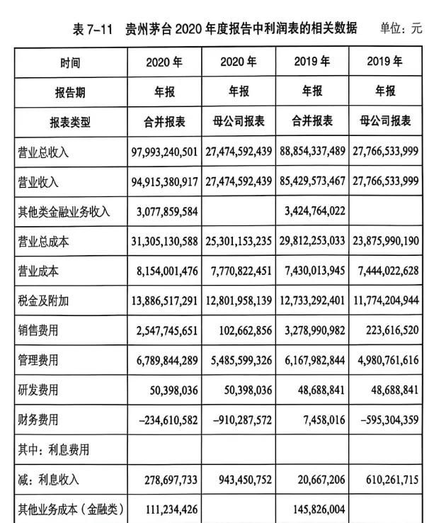 下表列示的是贵州茅台2020年度报告中利润表的部分数据。
