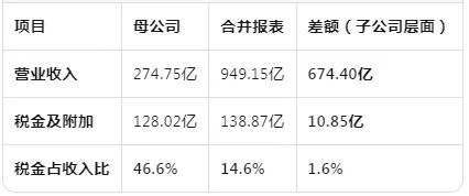 核心发现:子公司贡献了71%的营业收入(674亿/949亿),但仅贡献了7.8%的税金及附加(10.85亿/138.87亿)