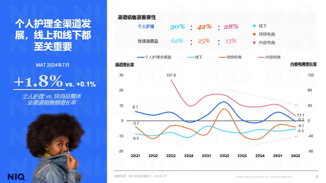 • 内容电商成唯一高增长渠道,抖音个护店铺格局剧变:截至MAT 2024年7月,内容电商同比增长32.0%,远超传统电商(-6.7%);在抖音6万+个护店铺中,67.3%为今年新开,同时66.1%去年关店,显示“短平快”打法盛行,品牌需具备快速测款、敏捷迭代能力。