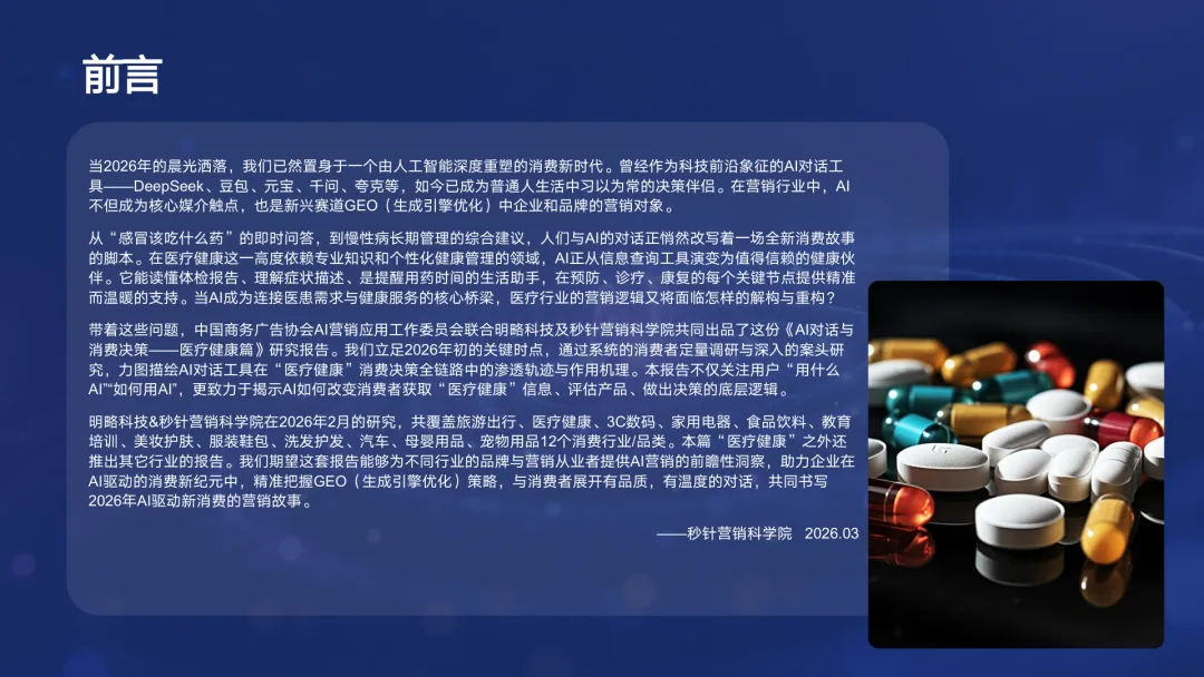 AI对话与消费决策研究报告(2026Q1)-医疗健康篇:由中国商务广告协会、明略科技、秒针营销科学院联合出品。基于全国1000名AI用户调研,揭示AI对话工具在医疗健康消费决策中的渗透、影响、信任与行为特征,为品牌GEO(生成引擎优化)提供数据支撑与策略方向。