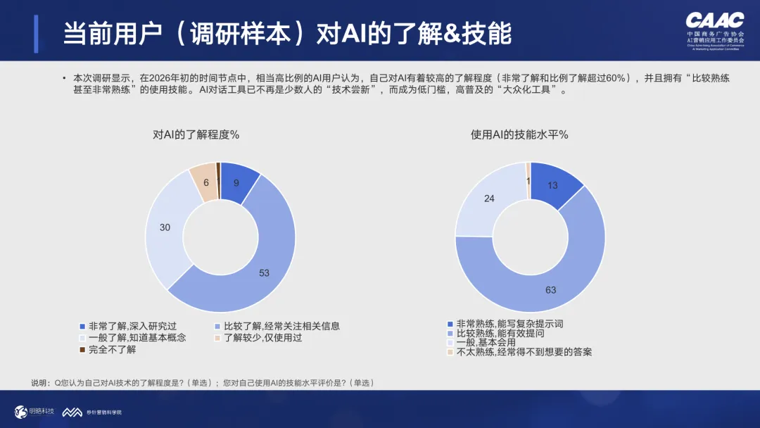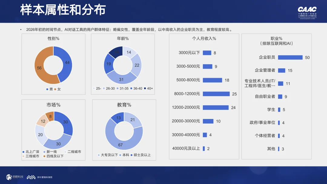 调研规模:全国1-4线城市1000名AI对话工具用户,2026年2月线上定量问卷。 用户特征:女性占比56%,26-40岁为主,中高收入、本科以上、企业职员居多。 AI熟练度:60%以上用户对AI了解较深,63%使用熟练,已成为大众化工具。