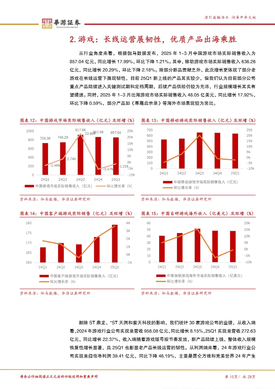 • 中国自研游戏海外收入达48.05亿美元(2025年Q1):同比增长17.92%,《寒霜启示录》等产品表现亮眼,叠加世纪华通、恺英网络等公司老产品长线运营稳健,表明出海游戏已进入“精品化+持续运营”阶段,适合B2B厂商对接SDK、本地化服务与联合发行。