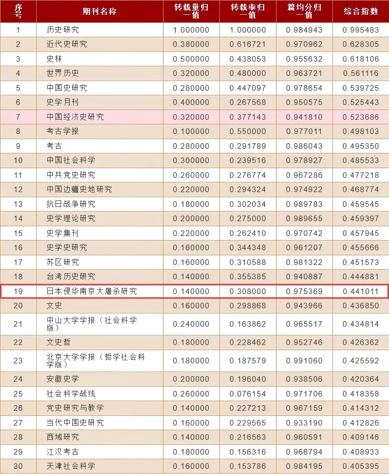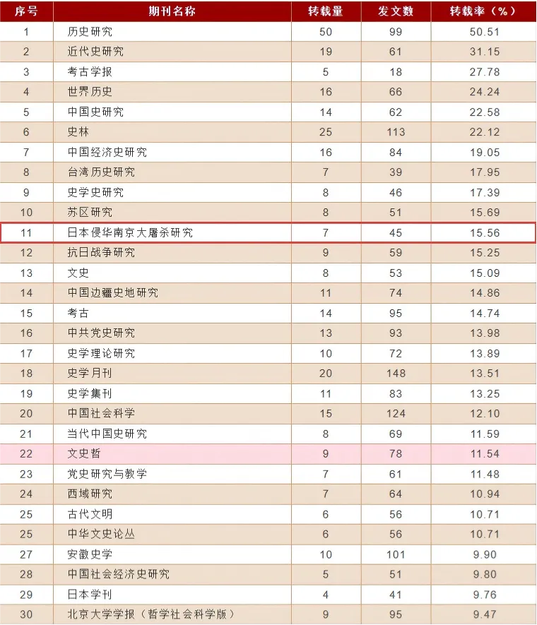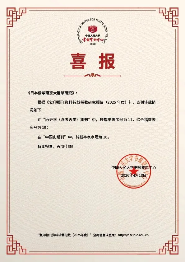 该报告显示,《日本侵华南京大屠杀研究》在被复印报刊资料学术刊全文转载的历史学期刊中,转载率排名第11位,综合指数排名第19位。