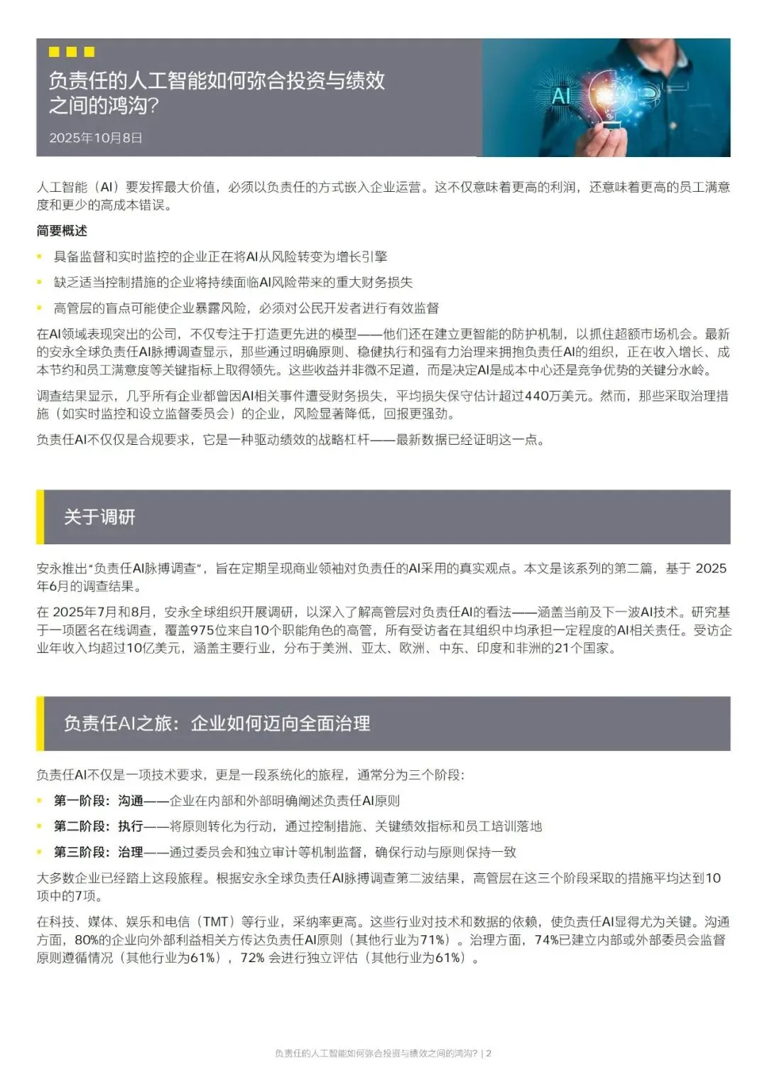 人工智能想要真正释放价值,必须以负责任的方式融入企业运营,这不仅能提升利润,还能提高员工满意度、减少高成本失误。当前企业普遍加大 AI 投入,但多数未能将投资有效转化为收入增长、成本节约等实际绩效,而负责任的 AI 正是打通投资与业绩之间鸿沟的关键。