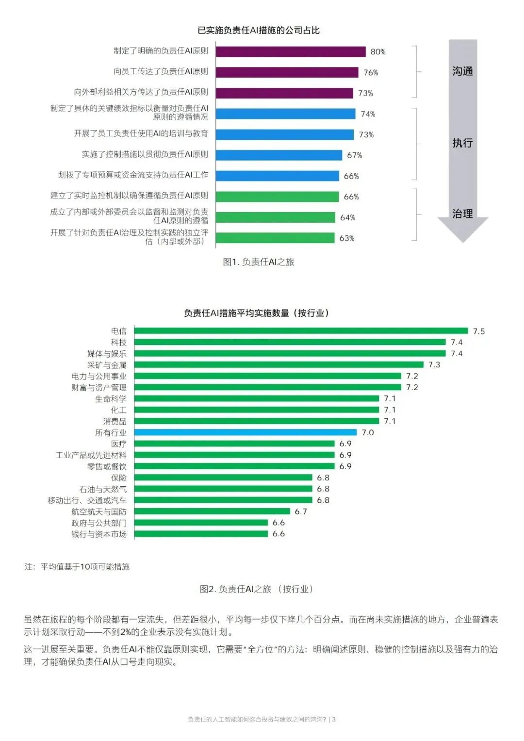 调研覆盖全球多地、年收入超十亿美元的大型企业高管,结果显示,负责任 AI 落地可分为沟通、执行、治理三个阶段。多数企业已推进相关举措,平均完成七成以上工作,其中科技、媒体、电信等行业落地程度更高。企业普遍制定 AI 原则、开展员工培训,但在实时监控、独立评估等治理环节仍有提升空间。