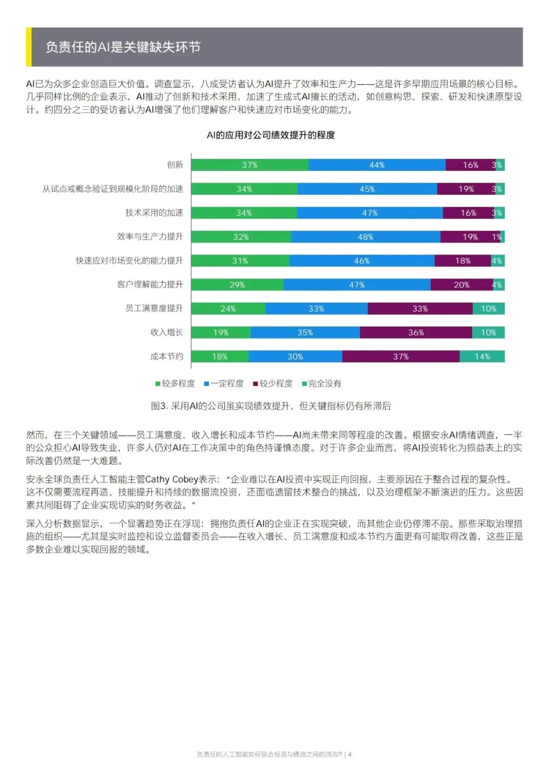 AI 确实能提升企业效率、推动创新、增强客户洞察,但在收入增长、成本节约、员工满意度三大核心指标上表现滞后。而建立实时监控、设立监督委员会等治理措施的企业,在这三项指标上的提升概率显著提高,证明负责任 AI 不是合规负担,而是驱动业绩的战略杠杆。
