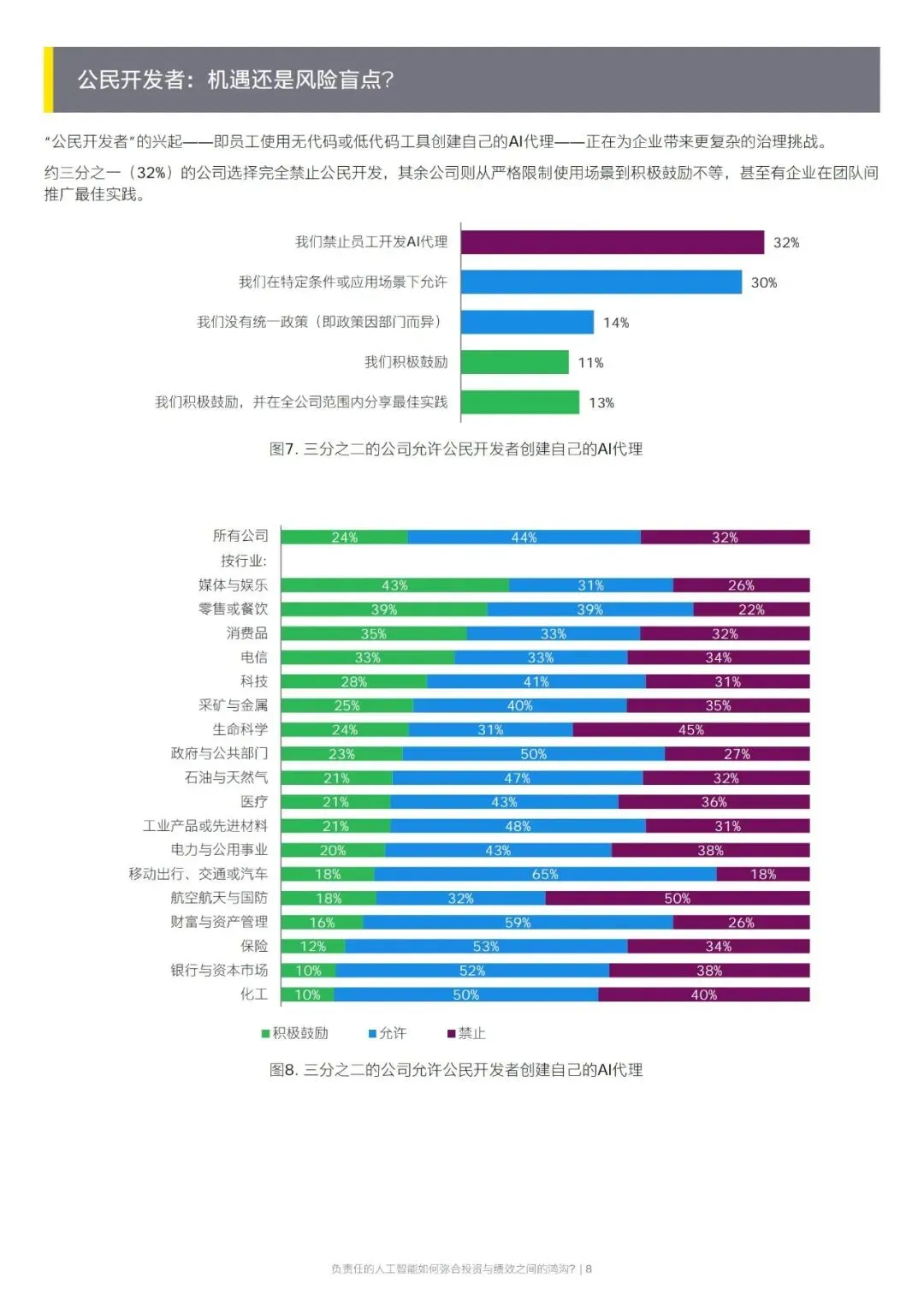 自主型 AI 普及和公民开发者兴起,带来新的治理挑战。多数企业已建立基础治理政策,但在跨部门协作、预算匹配、事件响应、责任归属等方面存在明显短板。公民开发行为在企业中普遍存在,近七成企业允许或鼓励,但仅有半数企业能有效监控实际行为,容易形成监管盲区。