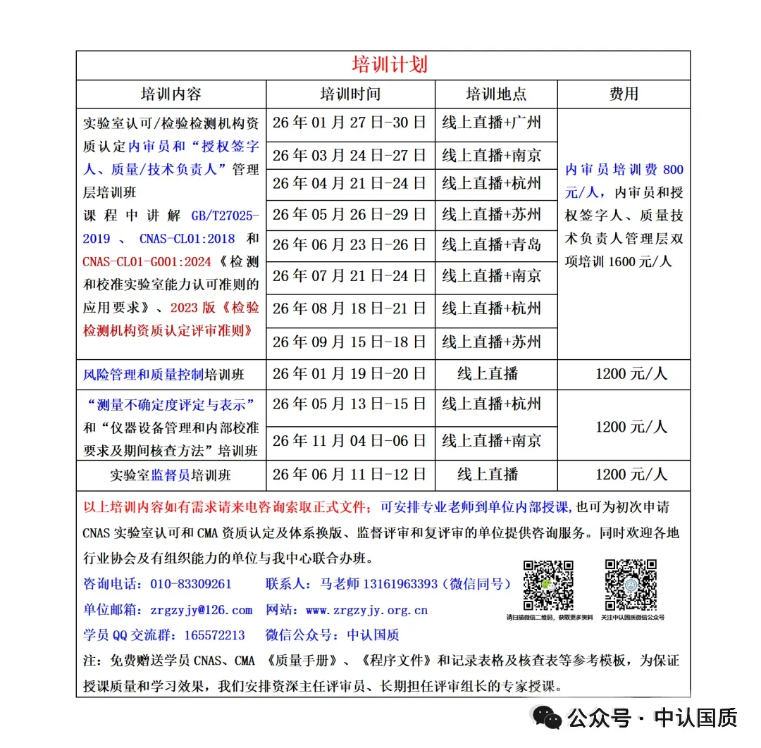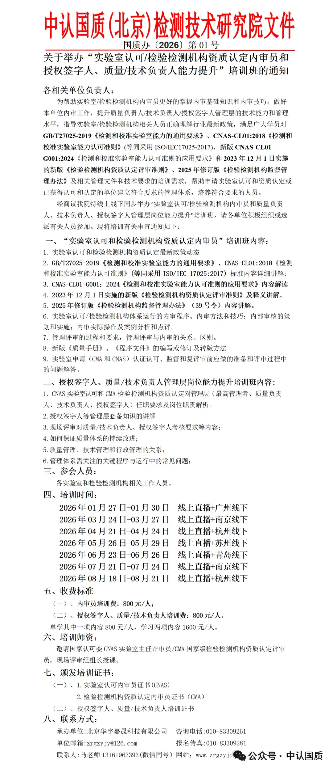 通知,我院2026年04月21日-24日(线上直播+杭州)、05月26日-29日(线上直播+苏州)、06月23日-26日(线上直播+青岛)、07月21日-24日(线上直播+南京)、08月18日-21日(线上直播+杭州)举办“CNAS实验室认可内审员、CMA检验检测机构资质认定内审员 和 授权签字人、质量/技术负责人管理层”培训课程,课程中详细讲解GB/T27025-2019、CNAS-CL01:2018《检测和校准实验室能力认可准则》(等同采用ISO/IEC17025-2017)、新版CNAS-CL01-G001:2024《检测和校准实验室能力认可准则的应用要求》和2023版《检验检测机构资质认定评审准则》及释义相关内容。内审员和授权签字人两项内容培训费:1600元/人,内审员培训费:800元/人,赠送学员CNAS、CMA新版《质量手册》、《程序文件》和质量记录表格等体系文件参考模版。凡参加线上培训的学员,后续可享受免费参加线下培训,请各单位领导给予大力支持,积极安排相关工作人员报名参加。同时也请大家帮忙转发。