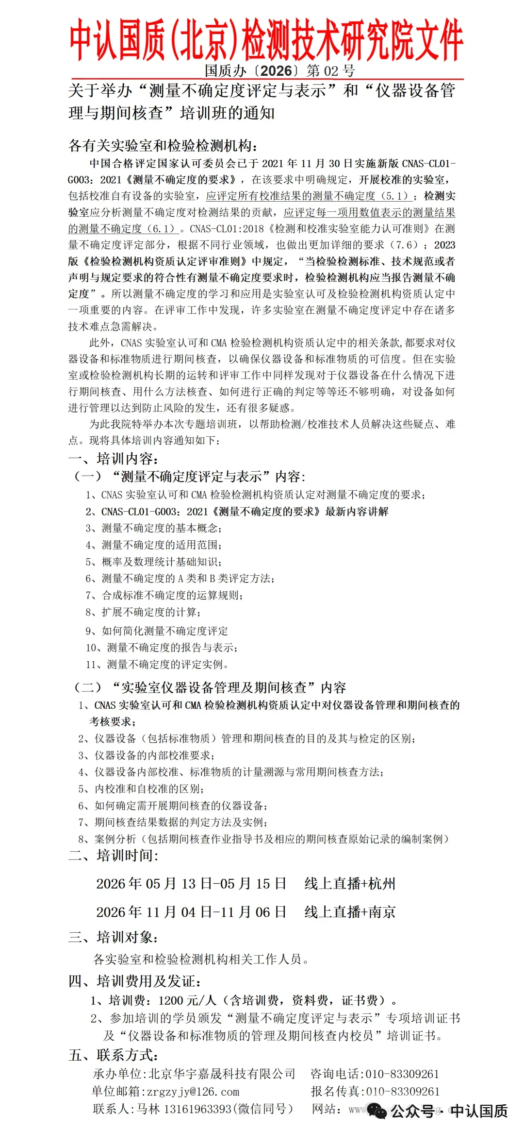 2026年05月13日-15日(线上直播+杭州)、2026年11月04日-06日(线上直播+南京)举办“测量不确定度评定与表示”和“仪器设备管理与期间核查、内部校准要求”培训班,课程中讲解2023年1月1日修订版CNAS-CL01-G003:2021《测量不确定度的要求》,CNAS-CL01-G002: 2021《测量结果的计量溯源性要求》,新版CNAS-CL01-G004:2023《内部校准要求》等最新要求。