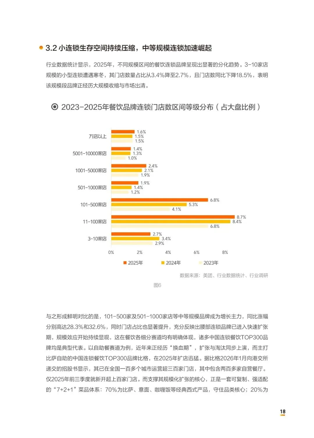 表层是内卷,底层是逻辑切换。饮品凭借高标准化和外卖补贴红利成为连锁化“火车头”,但正餐、火锅连锁化率下滑,说明“重模式”品类在价格战中首当其冲。更关键的是,中等规模品牌(101-500家店)门店数逆势增长28.3%,而小型连锁加速出清——行业正从“散兵游勇”走向“专业军团”,规模不再是护身符,运营效率才是分水岭。