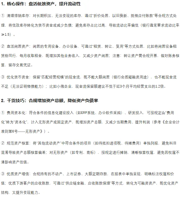 ③借力供应链金融:依托优质核心客户的信用,申请供应链金融产品(如核心企业担保贷、应收账款保理),既解决融资难题,又能优化报表中的应收账款科目,提升资产质量。