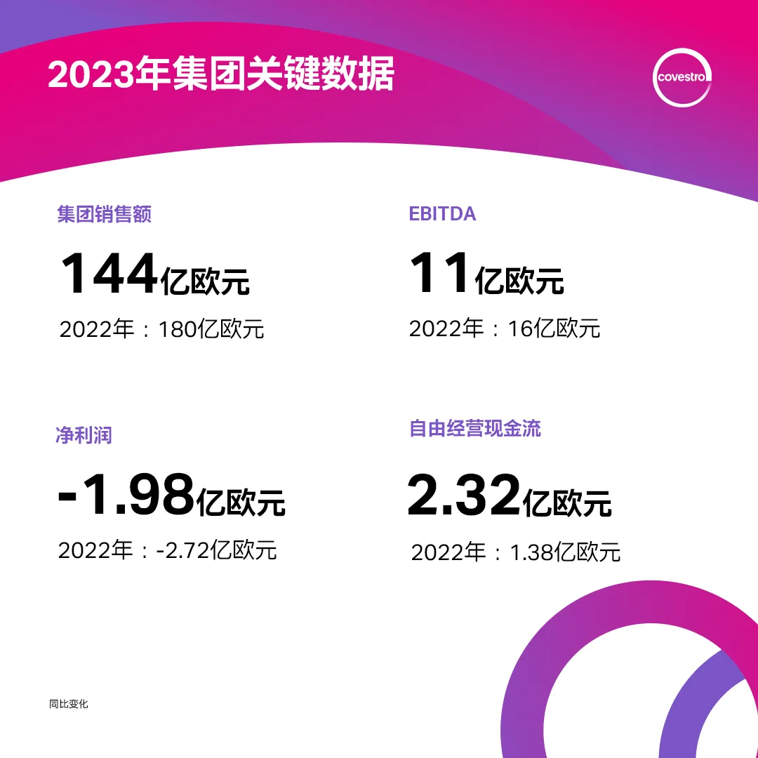 由于全球需求疲软,销售价格低于平均水平,销量减少,导致集团销售额下滑。2023年销售额较2022年下降20%至144亿欧元。息税折旧摊销前利润(EBITDA)同比下降33.2%至11亿欧元。2023财年净利润为-1.98亿欧元,尽管仍未转正,但相较2022年(-2.72亿欧元)已略有改善。此外,得益于持续的营运资本管理,科思创再次取得2.32亿欧元的正自由经营现金流(2022年:1.38亿欧元)。已使用资本回报率减去加权平均资本成本(ROCE over WACC)的差值为负6.1个百分点(2022年:负5个百分点)。集团范围1和2温室气体排放量小幅上升至490万吨二氧化碳当量(2022年:470万吨),主要原因是去年在美国和德国购买的电力和蒸汽的能源碳排放更为密集。