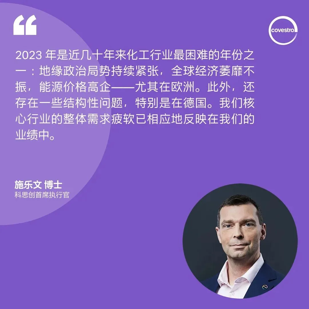 施乐文博士还表示:“因此,在过去一年里,我们通过四个关键手段,更加坚定地推动‘可持续未来’战略的实施。它们包括永久性地充分利用我们的设施,提高销量并优化产能利用率,关注高利润率的需求,以及最后但同样重要的——继续保持成本意识。2024年,我们将以此继续全力推进科思创转型。”