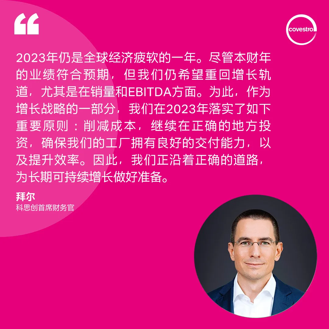 尽管2023年的市场环境极具挑战性,但科思创在该财年中坚持继续优化生产流程。例如,公司成功提升了中国上海和德国多马根基地生产设施的能效。集团还在2023年削减了数亿欧元的固定成本。