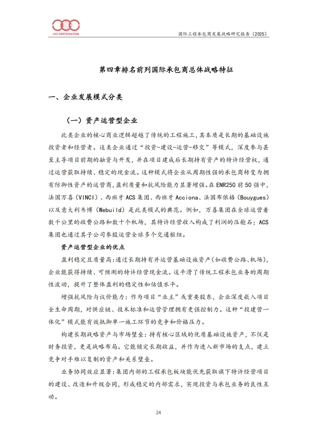 资产运营型(如万喜Vinci):投资-建设-运营,获取长期现金流。