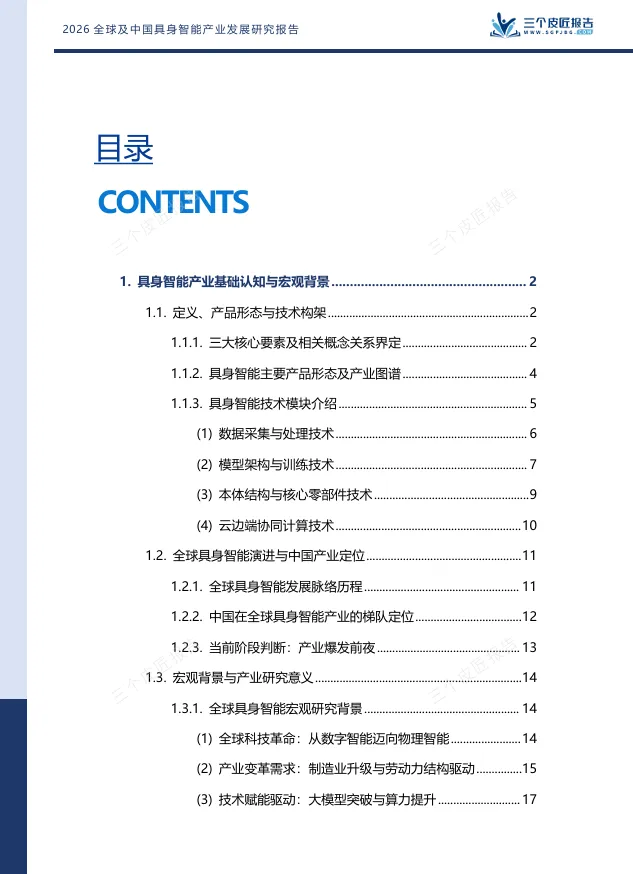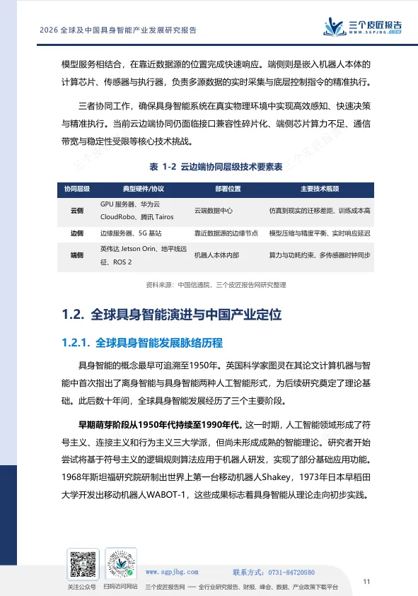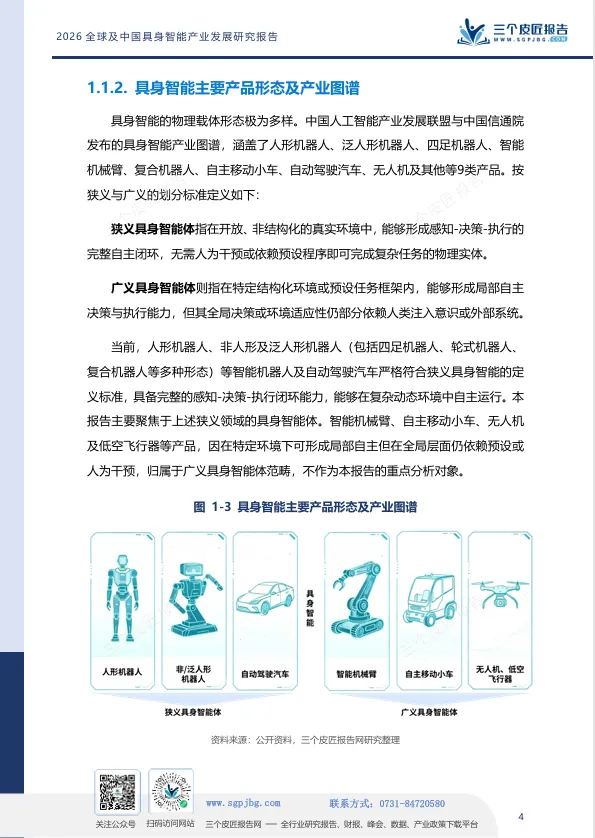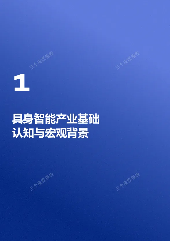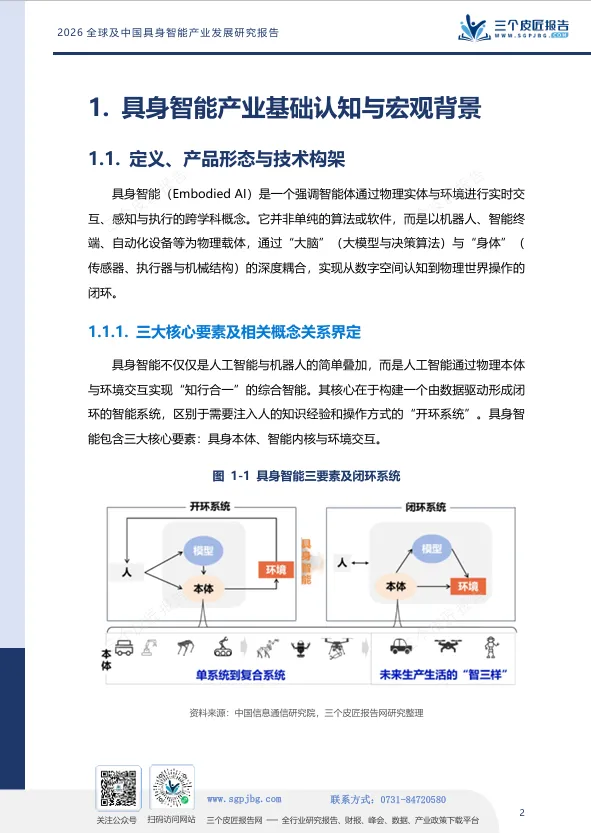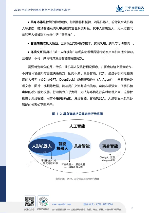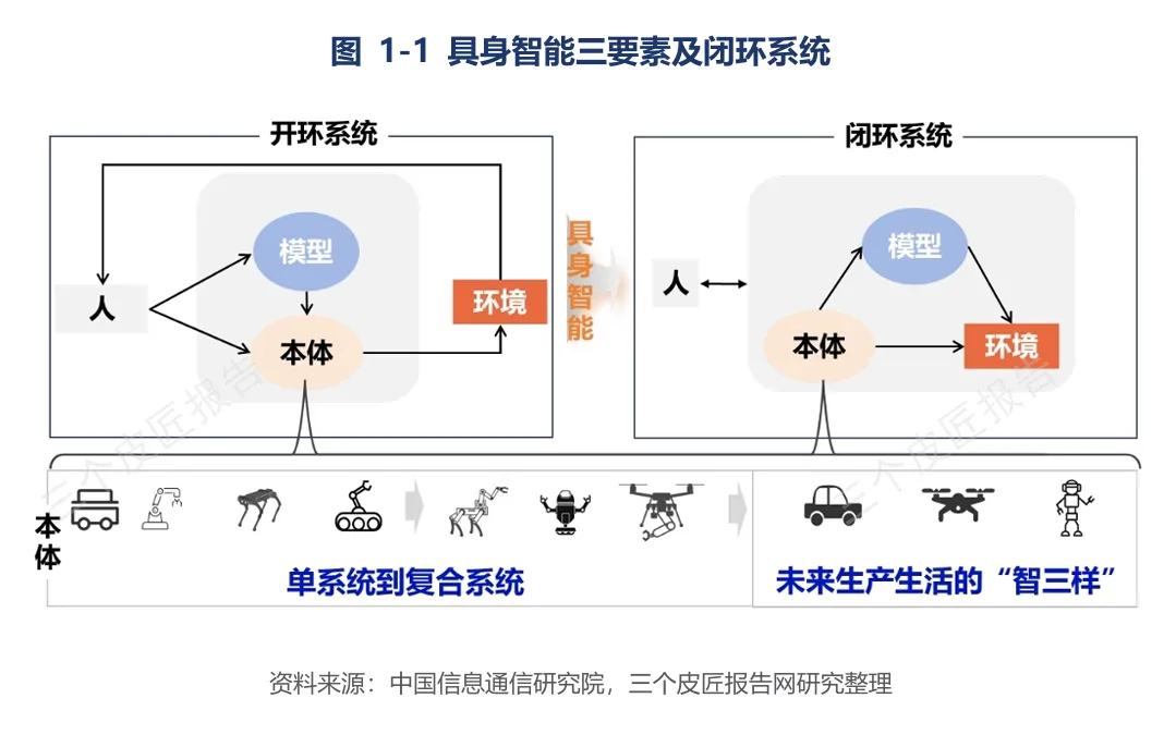 报告开篇给出清晰定义:具身智能是强调智能体通过物理实体与环境进行实时交互、感知与执行的跨学科概念。其三大核心要素为:具身体本(物理载体)、智能内核(大模型与决策算法)、环境交互(第一人称视角的动态适应)。三者缺一不可,构成“感知—决策—行动”的完整闭环。