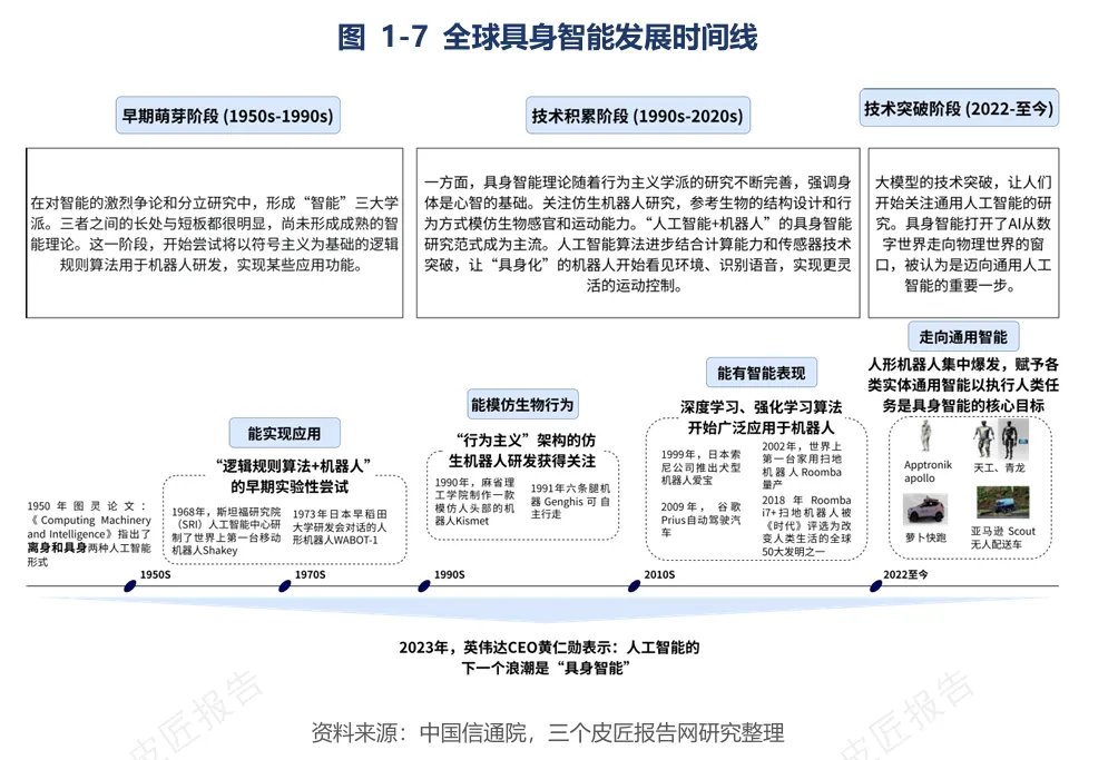 具身智能概念可追溯至1950年图灵的论文。此后经历了早期萌芽(1950s-1990s)、技术积累(1990s-2020s)和技术突破(2022至今)三个阶段。大模型的技术突破是具身智能进入爆发期的核心催化剂,VLA模型和世界模型的出现使机器人具备了在真实环境中理解任务、规划路径并执行动作的能力。