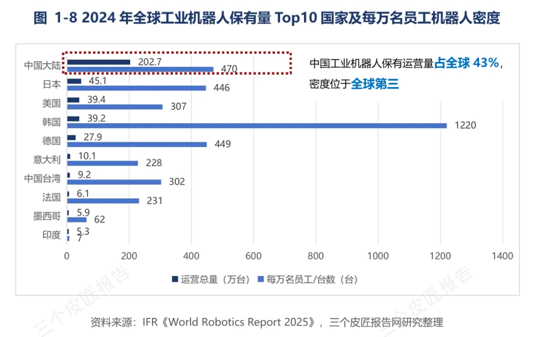 2024年中国在役工业机器人存量突破200万台,占全球43%,位居全球首位。新安装工业机器人29.5万台,占全球54%以上。机器人密度达470台/万人,位列全球第三,超越德国和日本。工业机器人的规模优势为具身智能向更高形态演进奠定了产业底座。