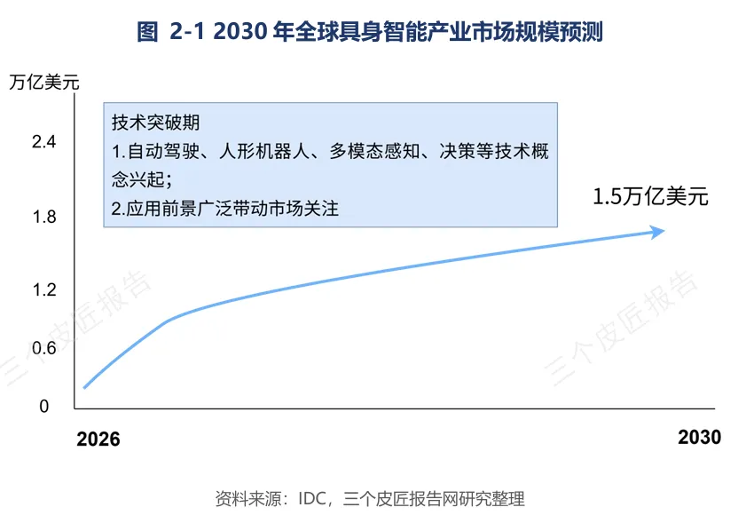 三个皮匠报告最新发布的《2026全球及中国具身智能产业发展研究报告》给出了一个量化判断:2025年全球人形机器人出货量约1.8万台,同比增长约508%;中国企业合计占据全球约74%的出货量份额,宇树科技以超5500台位居全球第一。IDC预计到2030年全球具身智能市场规模将达到1.5万亿美元。
