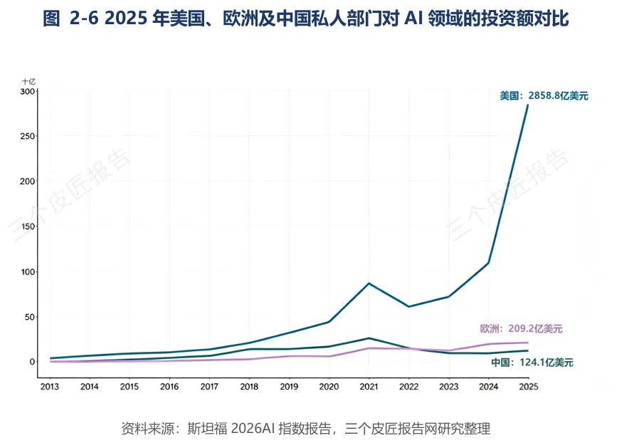 美国拥有全球5427个数据中心(超过其他任何国家10倍以上),2025年私人部门AI投资额2859亿美元,远超中国和欧洲总和。英伟达在全球AI训练芯片市场占据超过90%份额,其CUDA生态构成难以逾越的壁垒。2025年美国具身智能融资呈现“低频高额”特征,Figure AI获15亿美元融资,Physical Intelligence融资4亿美元。