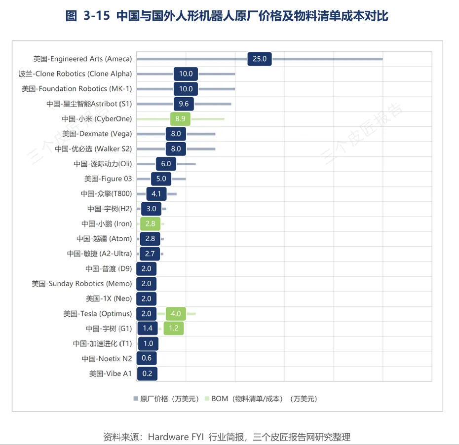 宇树科技G1基础版售价约1.4万美元,BOM成本约5800美元;特斯拉Optimus当前BOM成本约4万美元。中国头部企业产品价格集中在2-4万美元区间,而美国同类产品普遍在15-25万美元。成本优势源于珠三角、长三角成熟的精密制造产业集群,以及新能源汽车与无人机产业的技术外溢。