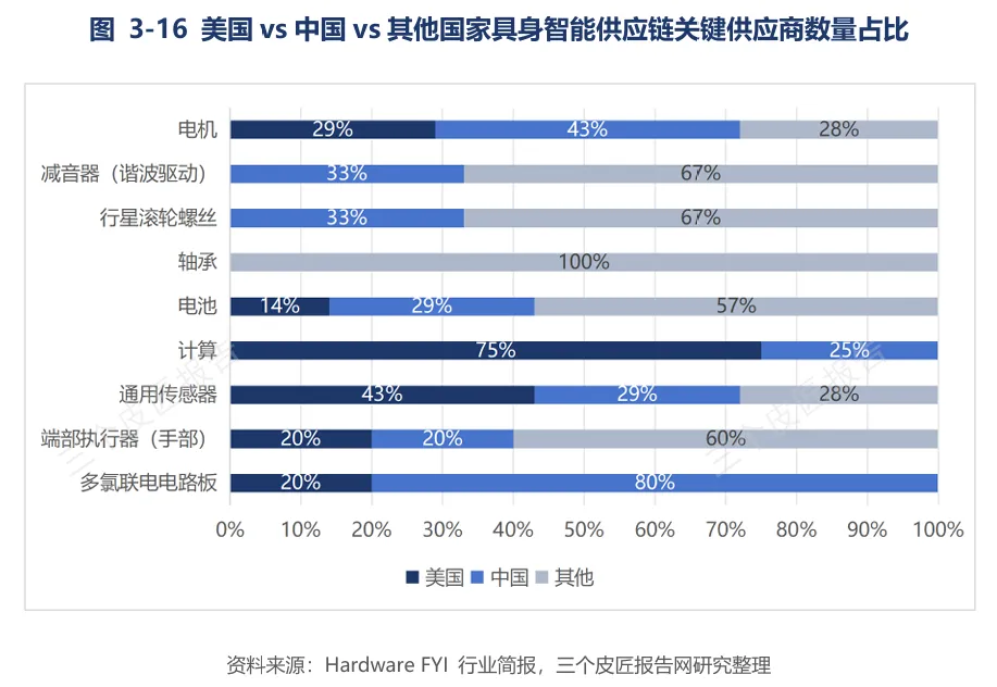 从核心零部件供应商数量来看,中国在减速器、伺服电机、传感器等领域的关键供应商数量远超美国和其他国家。一台人形机器人约需配置20-40个执行器,谐波减速器占执行器成本约36%,力矩传感器占约30%。中国在减速器、伺服电机等环节已形成密集供应商网络,构成了难以复制的成本护城河。