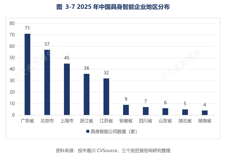 截至2025年底,全国286家具身智能公司(不含上游零部件),84%集中在广东、北京、上海、浙江、江苏五大省市。广东以71家位居首位,依托大湾区制造业基础形成完整产业链;北京以57家位列第二,聚焦算法与原始创新;上海以45家排名第三,构建全产业链生态。各区域依托不同资源禀赋形成差异化路径。