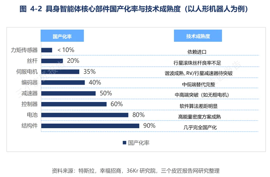 以人形机器人为例,执行器系统(电机、减速器、丝杠等)约占整机成本45%,传感器系统约占15%,两者合计超60%。当前执行器国产化进展较快,减速器国产化率约50%,伺服电机约35%;而高端力矩传感器国产化率不足10%,是最依赖进口的环节。