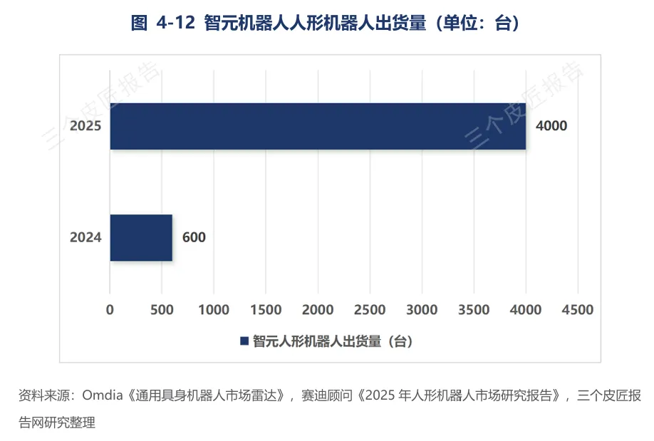 智元机器人2025年出货超4000台,累计下线5000台,2026年目标2-3万台;已形成远征、灵犀、精灵三大系列,覆盖八大场景。