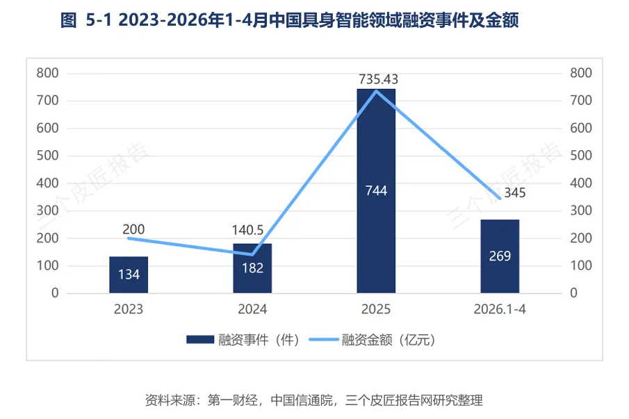 2023-2025年,中国具身智能领域融资从百亿级跃升至735.4亿元,2025年同比增幅超4倍。2026年前四个月已吸纳约345亿元,接近2024年全年两倍。融资事件从2023年的134起增至2025年的744起。资本正加速向头部项目集中,宇树科技、智元机器人、银河通用等接连完成数亿至数十亿元融资。