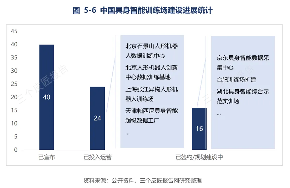 截至2025年底,中国已宣布的国有或官方支持训练场超过40座,其中至少24座已投入运营。北京石景山训练场占地超万平方米,年产数据超600万条。2026年“十五五”规划将“统筹布局具身智能实训场”写入国家战略,京东、帕西尼、智元等新项目密集落地。