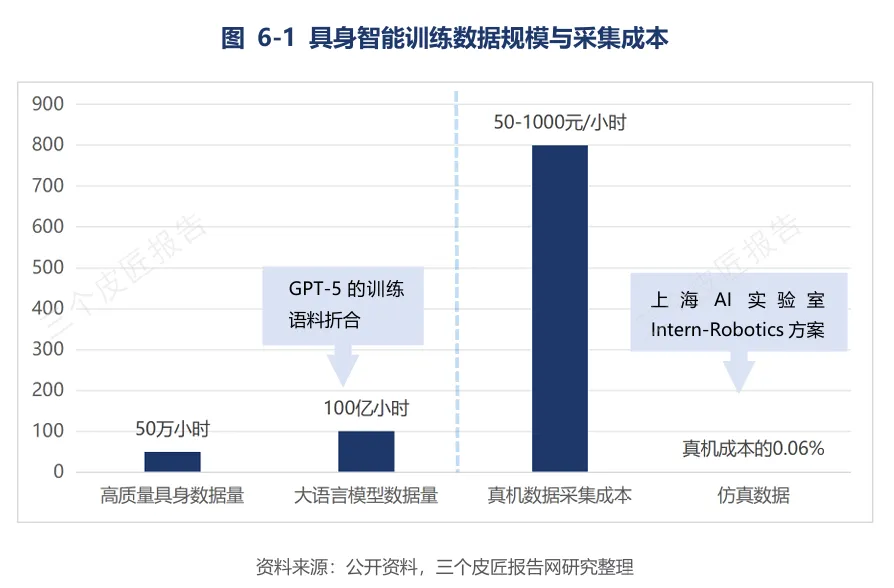 通用大语言模型训练语料约100亿小时,而行业内可用高质量具身数据仅约50万小时,存在超过万倍的差距。真机数据采集成本高达每小时50-1000元,高昂成本使得大规模采集在商业上不可行。超过90%的训练场因运营能力不足沦为“形象工程”。