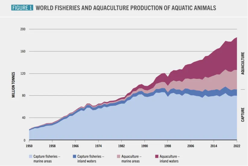 渔业生产包括捕捞渔业和水产养殖。2022年,全球水产养殖首次超过捕捞渔业,达到前所未有的1.309亿吨,其中9440万吨为水生动物,占水生动物总产量的51%,成为水生动物的主要生产者。水产养殖的增长表明其有能力进一步满足全球日益增长的水产食品需求。目前,少数国家主导着水产养殖业,其中十个国家——中国、印度尼西亚、印度、越南、孟加拉国、菲律宾、韩国、挪威、埃及和智利——的产量占总产量的89.8%以上。2022年捕捞渔业产量为9230万吨,中国为第一生产国,占比14.3%,其次是印尼(8%)、印度(8%)、秘鲁(5.8%)、俄罗斯(5.4%)、美国(4.6%)、越南(3.9%)和日本(3.2%)。