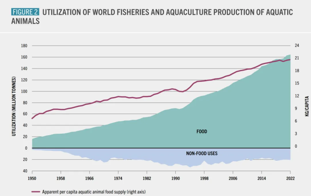 水产动物的89%用于人类直接消费(CHD),其余部分则用于鱼粉和鱼油生产等间接或非食品用途(CHI),凸显了渔业和水产养殖在维护全球粮食安全方面的关键作用。2021年,全球水产动物食品消费量达到1.625亿吨。自1961年以来,这一数字的增长速度几乎是世界人口增长速度的两倍,全球人均年消费量从1961年的9.1公斤增长到2022年的20.7公斤。此外,水产食品提供优质蛋白质,以及包括ω-3脂肪酸、矿物质和维生素在内的关键营养素,对于促进全球健康饮食和改善营养至关重要。