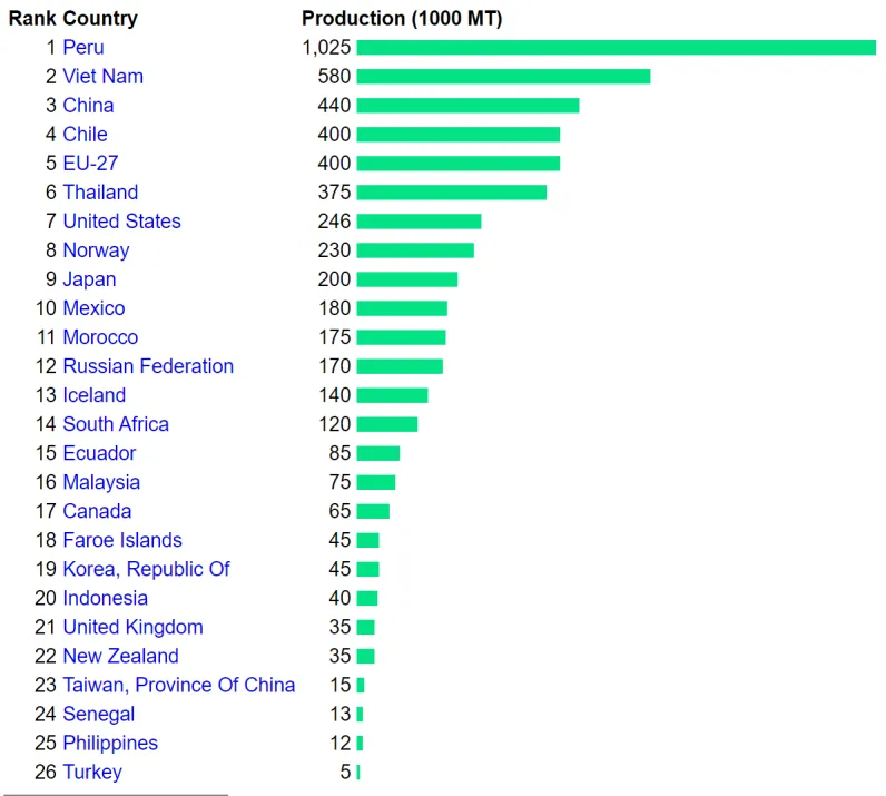 根据海洋原料机构(IFFO)数据,2025年一季度,全球鱼粉累计总产量同比增长约29%,主要得益于秘鲁以及智利、美国、西班牙和非洲国家产量大幅增长;全球鱼油累计总产量同比增长34%,同样受秘鲁的推动。秘鲁、智利、丹麦、法罗群岛、冰岛、科特迪瓦、毛里求斯、挪威、英国、美国等国占全球鱼粉产量的40%,鱼油产量的50%。